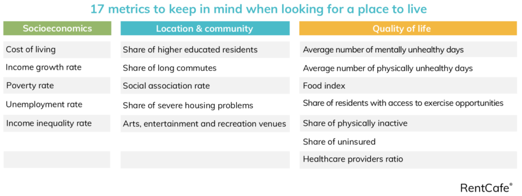 Note: RentCafe.com grouped the most important criteria into three key categories: socioeconomics (aspects like cost of living, income growth rate, unemployment rate, etc.), quality of life (healthcare providers, food index, access to exercise options, etc.), and location and community (share of higher-educated residents; social association rate; arts, entertainment and recreation venues; share of long commutes, etc.).
